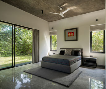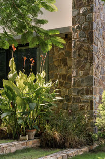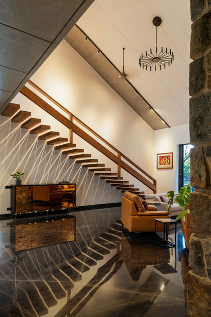 Two massive, orthogonal walls of Delhi Quartzite act as the spine of the house. These are not merely load-bearing elements; they are the visual anchors that organize the chaos of domestic life. They frame the flows—of wind, of light, and of movement—transforming the act of walking from one room to another into a sequence of revelations.