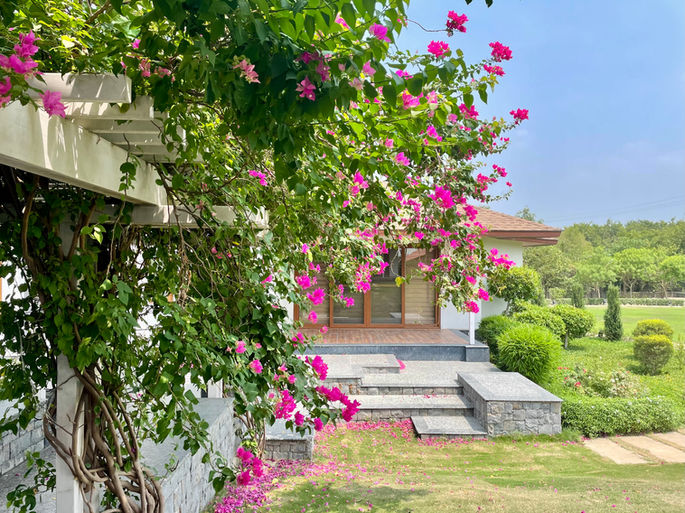 Shaded verandahs wrap around the living spaces, opening them to gardens on all sides. Bougainvillea-covered trellises soften the stone plinths, allowing the landscape to climb up to the built form. The garden is not ornamental — it is lived in, walked through, occupied in fragments of time.